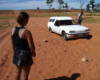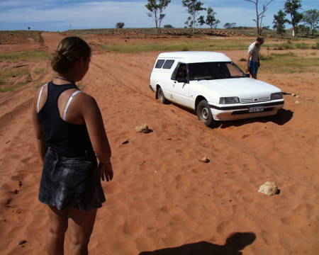 Wir hatten ja mit der Moeglichkeit gerechnet, also machten wir uns gleich an die Arbeit und versuchten, den Wagen irgendwie wieder flott zu kriegen. - Aber nach etwa 40 Minuten waren wir immer noch dabei und das gute Stueck hatte sich noch nicht einen Centimeter bewegt. Aber auf dieser Strecke ist verhaeltnismaessig "viel Verkehr". Man bleibt nicht laenger als eine Stunde alleine. So fragten wir den naechsten 4WD, ob er uns raushelfen koenne. Gefragt, getan. Kein Problem.