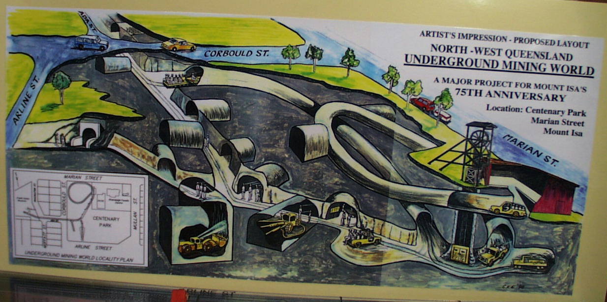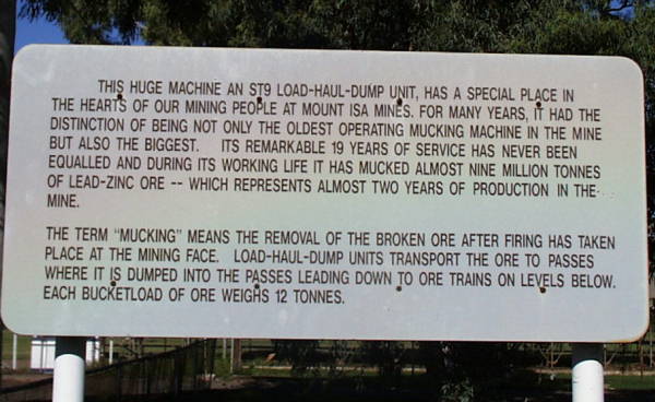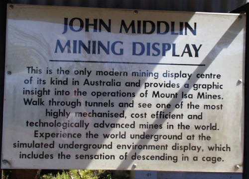 Die Mine in Mt Isa baut Kupfer, Blei, Zink und Silber ab. Allerdings gehen die Vorraete so langsam auf die Neige. Daher hat man 20km von Mt. Isa die Hilton Mine angefangen. Dort sollen noch grosse Vorkommen auf den Abbau warten. Den Weg will man Uebertage ueberbruecken. Das heisst, das LKW's den Transport besorgen werden.